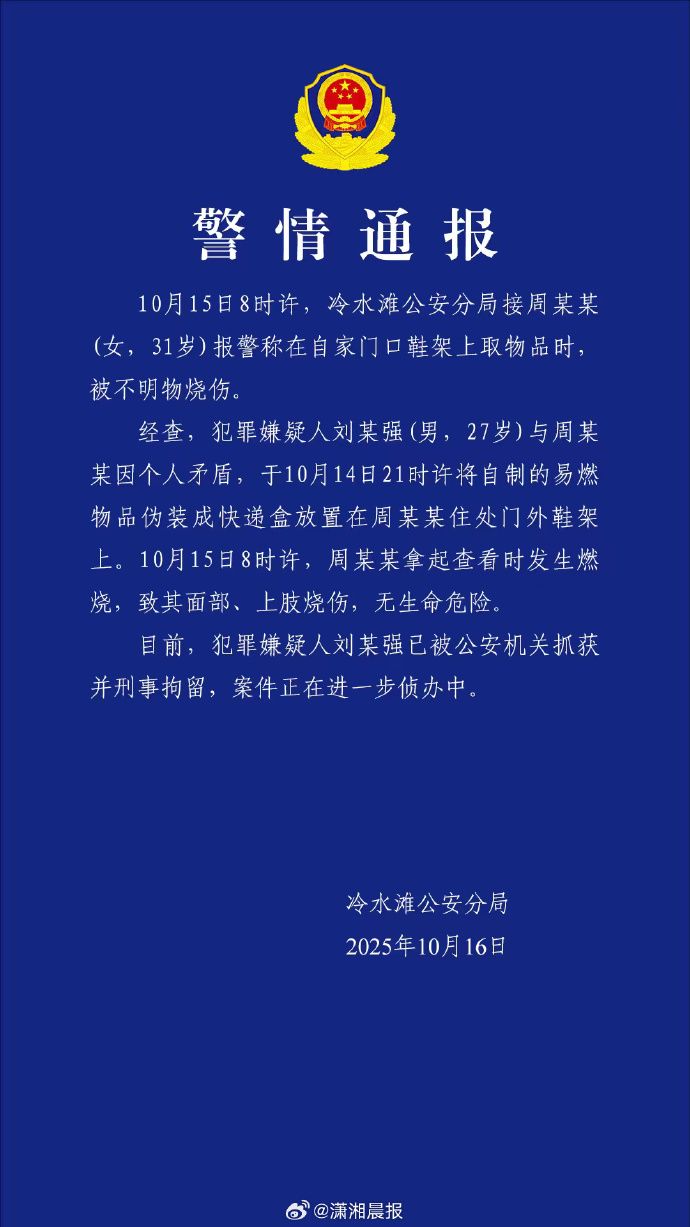 经查,犯罪嫌疑人刘某强(男,27岁)与周某某因个人矛盾,于10月14日21时许将自制的易燃物品伪装成快递盒放置在周某某住处门外鞋架上。10月15日8时许,周某某拿起查看时发生燃烧,致其面部、上肢烧伤,无生命危险。